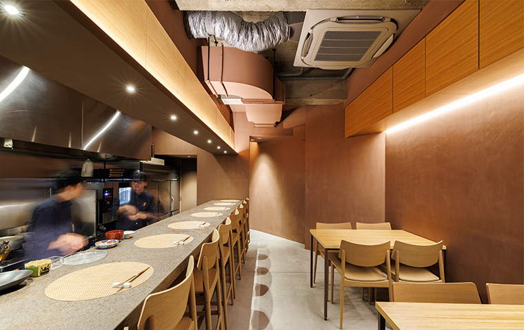 客席側には6メートルのカウンターを設け、無駄なく空間を活かしつつ、客席と厨房を回遊できる実用性も兼ね備えている。
